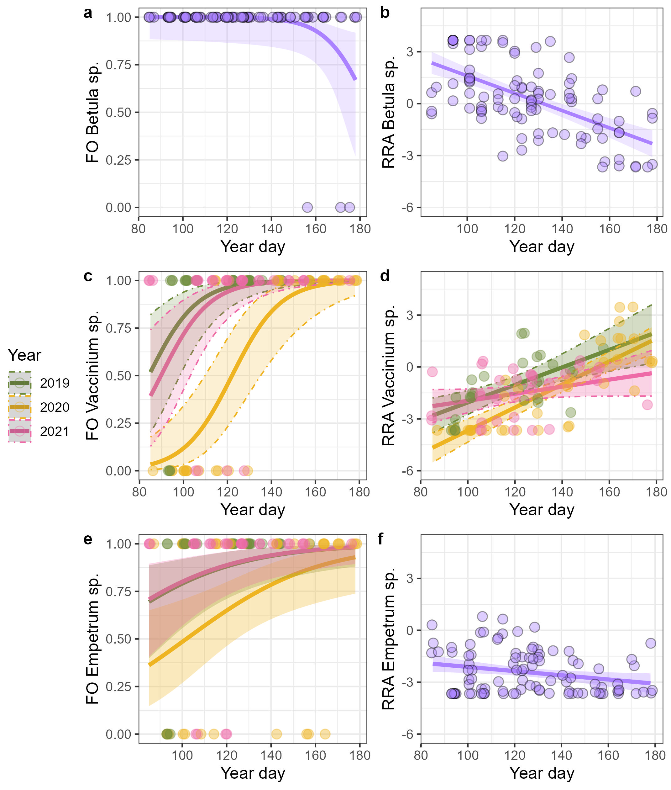 Fig. 4. Estimated relationship (solid line) between FO and RRA of Betula (a; b), Vaccinium (c; d) and Empetrum (e; f) in samples and day of the year.