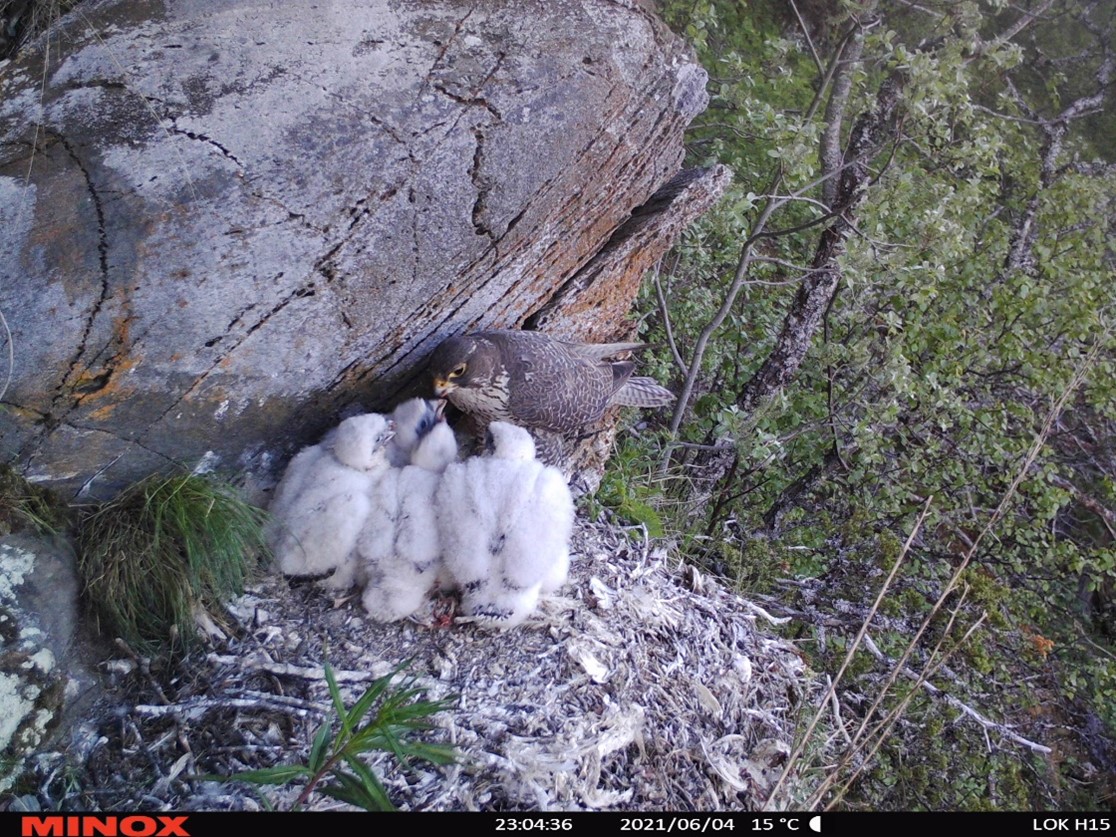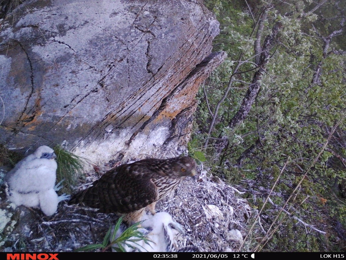 From 2018 to 2022, we monitored 11 gyrfalcon nests in central Norway using motion-trigged wildlife cameras. (Fig. 1). On the night of June 5th, 2021, our cameras captured footage of a northern goshawk attacking and killing three gyrfalcon nestlings. Three hours before the attack happened, the female gyrfalcon was recorded at the nest feeding her four nestlings (Fig. 2).